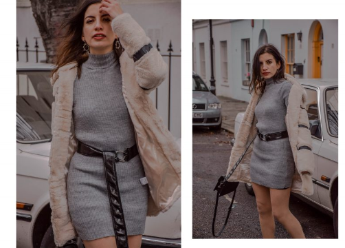 Here I am wearing this lovely Grey High Neck Bodycon Jumper Dress – Esmelia by Femme Luxe – Lately, I am obsessed with the bodycon dresses that also can be worn with a belt around the waist. It’s so French style, also so chic! I love to pick few colors and just go with them on an outfit. It gives the look a little more interesting vibe. Also, the grey tones are perfect for Winter and I love how they match perfectly with black accessories.