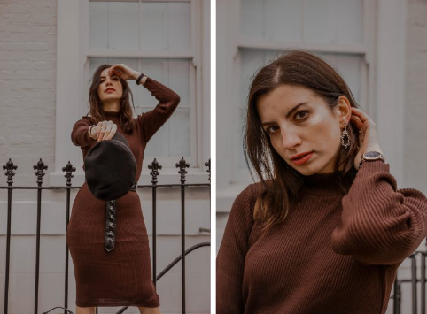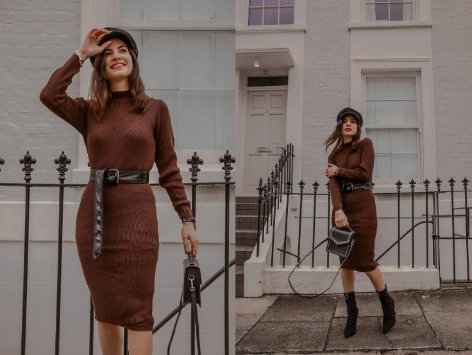 Here I am wearing this gorgeous Brown Knitted Ribbed Long Sleeved Midi Dress – Ellis which is long enough to keep me warm but also chic enough to stroll around Notting Hill on the weekend!