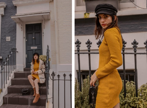 To brighten up these Winter days, I felt there was a need of a little bit of sunshine. Sometimes the sky gets so grey and white here in London, it’s almost impossible to see a spark. So, I thought why not add a little yellow in our lives? This comfy one is the Mustard High Neck Bodycon Jumper Dress – Esmelia by Femme Luxe and I love how casual and cute it looks paired up with creamy tones! I was matching with a lot of the neighbourhood houses in Notting Hill that day!